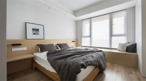 主臥空間以原木地板為基調(diào),搭配白色墻面與灰自組合的床品,打造出簡(jiǎn)約而不失品位的氛圍。選擇原木飾面的家具,與整體設(shè)計(jì)風(fēng)格保持一致,讓主臥成為一個(gè)寧?kù)o而舒適的私人空間。